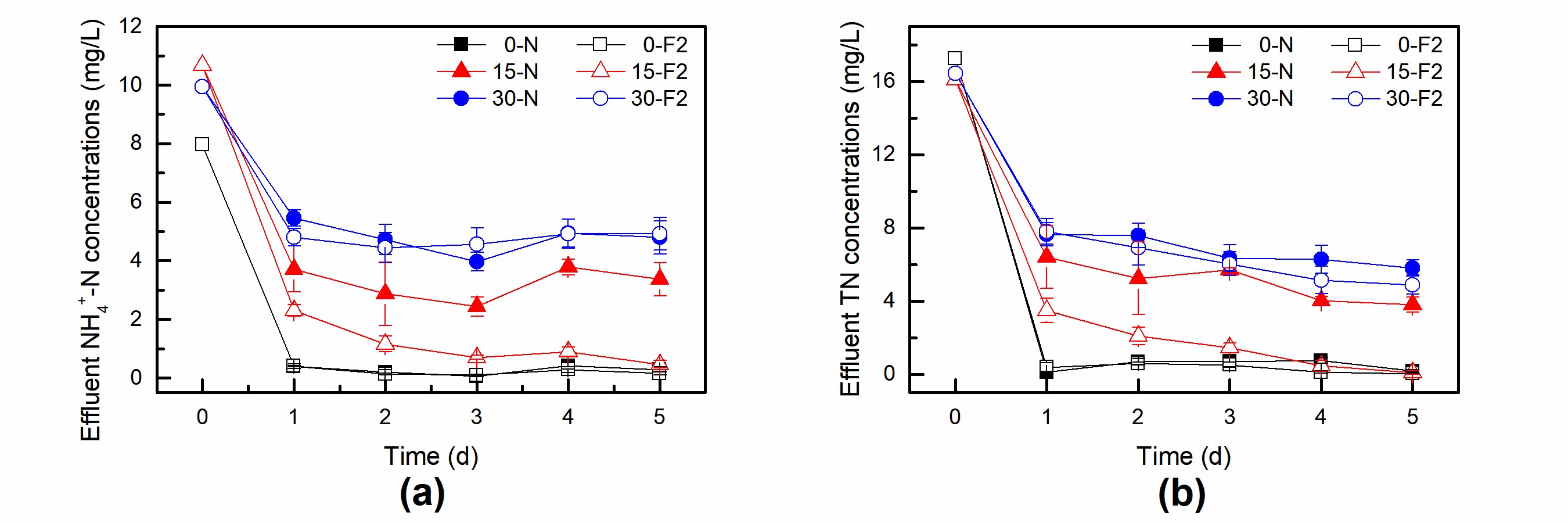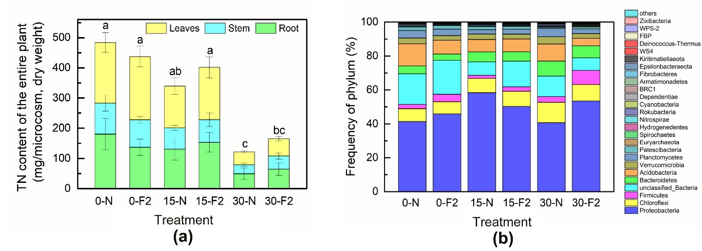 研究表明,人工濕地接種外源耐鹽脫氮菌Alishewanella sp. F2后,含鹽廢水中氮的去除率和人工濕地整株植物的氮吸收量顯著提高,當(dāng)進(jìn)水電導(dǎo)率(EC)為15 mS/cm時(shí),微生物強(qiáng)化的人工濕地對(duì)氨氮和總氮的去除效率(95.7%和99.4%)顯著高于對(duì)照組(68.5%和76.4%)。高通量測(cè)序發(fā)現(xiàn),耐鹽脫氮菌Alishewanella sp. F2不僅增加了人工濕地中其他土著脫氮功能菌的豐度,有效緩解了鹽脅迫對(duì)微生物脫氮功能的抑制效應(yīng);還增加了根際促生菌等土著微生物的豐度,進(jìn)而提高了人工濕地植物的生長(zhǎng)能力及整株植物氮吸收量。因此,接種外源耐鹽脫氮菌Alishewanella sp. F2同步提升了人工濕地中微生物和植物的活性,從而提高了鹽脅迫條件下人工濕地的脫氮效率。本研究為人工濕地高效去除含鹽廢水中含氮污染物提供了一種新的解決方案,有利于拓寬人工濕地在水處理中的應(yīng)用領(lǐng)域,同時(shí)對(duì)深入理解外源微生物與土著微生物交互作用提供了有力證據(jù)。