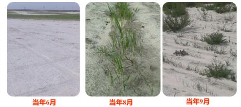該方法主要是在生長季早期,用犁在鹽堿地中開一條10-15cm的溝,在溝中覆蓋沙土,在沙土中播種羊草種子,在周圍鹽離子沒進(jìn)入沙土中時(shí),羊草能夠迅速萌發(fā),并利用羊草成株耐鹽堿能力較高并且能夠無性繁殖的特點(diǎn),迅速恢復(fù)植被(圖1)。該方法特點(diǎn)是,利用植物生長的特性、施加區(qū)域現(xiàn)有資源,為生物早期生長營造微環(huán)境。這種恢復(fù)方法成本低、效果好(圖2),為鹽堿化草地恢復(fù)提供了重要的科技支撐。