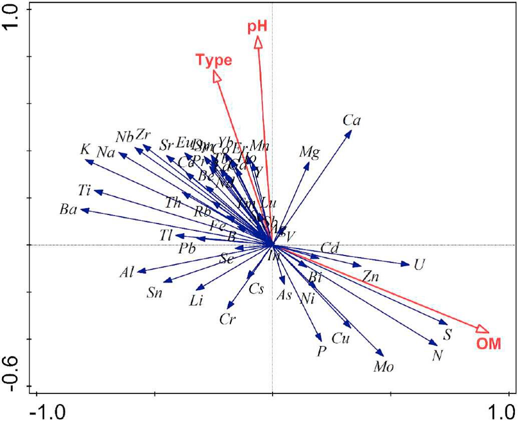 圖1 土壤元素組成與約束環境變量的RDA排序圖