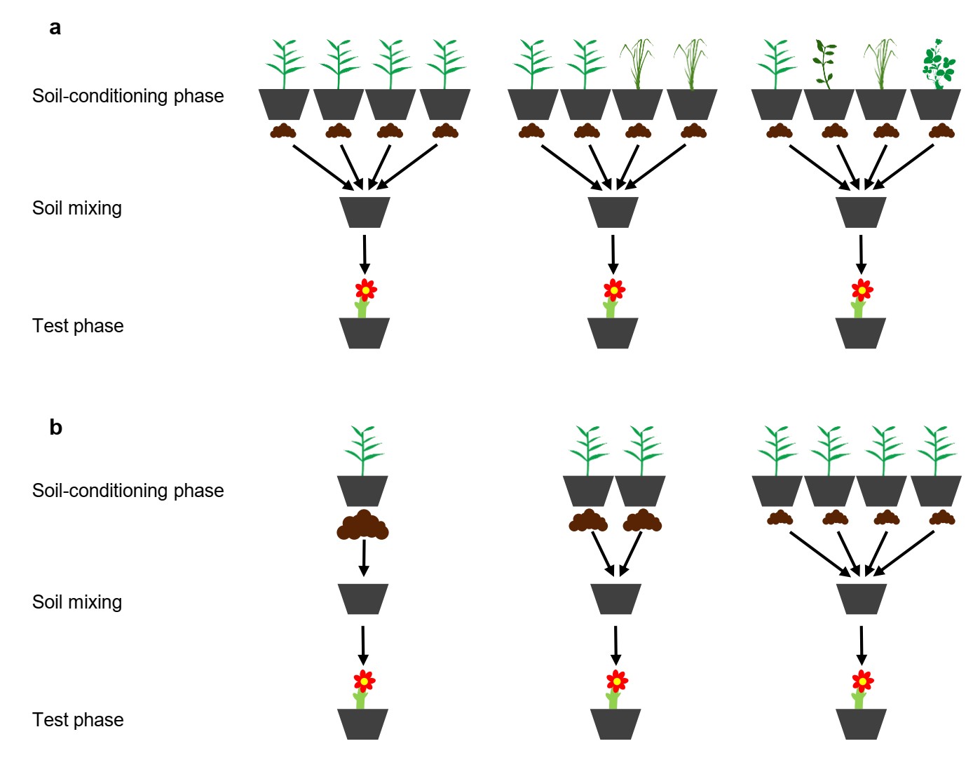 針對以上研究缺口,中科院東北地理與農業生態研究所生物入侵生態學研究團隊與德國康斯坦茨大學生態學研究團隊借鑒植物-土壤反饋的研究方法,利用溫室控制實驗,探究了本地植物多樣性如何通過土壤微生物調控外來植物的入侵過程。實驗第一階段,研究人員利用不同的本地植物物種馴化土壤微生物群落,并測定了不同植物馴化后的土壤微生物群落多樣性。實驗第二階段,研究人員將來自不同植物馴化過的土壤人工混合,組成不同的植物多樣性梯度的馴化土壤(分別是多樣性1、2和4),然后在這些土壤里種植外來植物,并測定其生長表現。