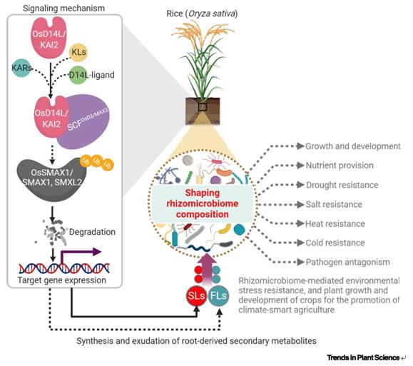 在水稻中,OsD14L(KAI2)受體結(jié)合KARs、KLs、D14L配體,與OsD3相互作用,形成SCFOsD3復(fù)合物,隨后以轉(zhuǎn)錄抑制因子OsSMAX1為靶向,進行泛素化并通過26S蛋白酶體降解,實現(xiàn)KAR、KLs、D14L的相關(guān)基因表達,通過SLs及FLs調(diào)控根際微生物組,進而促進植物生長發(fā)育、養(yǎng)分吸收、提高植物抗干擾能力。