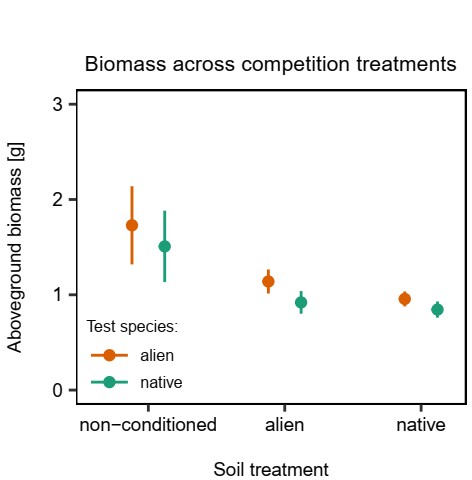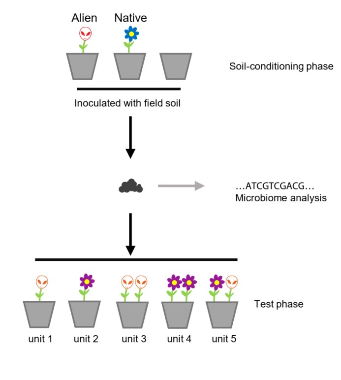 外來入侵生物造成的生態(tài)破壞與經(jīng)濟損失使得我們急需探究外來種成功入侵的原因。長久以來,高競爭能力一直被認為是外來種成功入侵的關(guān)鍵。但是過去的研究大多關(guān)注兩物種競爭(一個本地種與一個外來種的競爭),很少探究多物種的競爭。此外,競爭有不同的類型,被廣泛研究的是對資源的競爭,但是競爭也可以通過其它營養(yǎng)級產(chǎn)生。因此,中國科學院東北地理與農(nóng)業(yè)生態(tài)研究所生物入侵生態(tài)學研究團隊與德國康斯坦茨大學生態(tài)學研究團隊通過實驗旨在研究第三個物種是否會通過改變土壤微生物來改變外來種和本地種的競爭結(jié)果。
