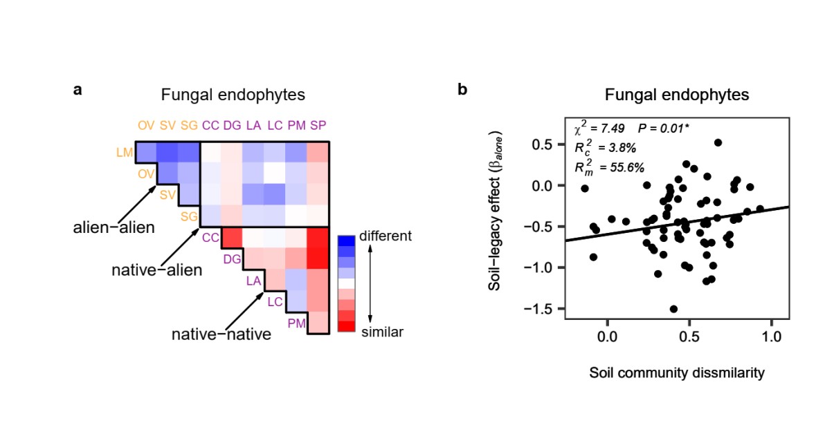 圖3 不同植物土壤微生物群落的相似度(a)。藍色代表相似度低,紅色代表相似度高。左上角為外來植物之間的相似度,右下角為本地植物之間的相似度,中間為外來植物與本地植物之間的相似度。土壤微生物群落相似度與土壤遺留效應(yīng)的關(guān)系(b)。正的土壤遺留效應(yīng)代表植物對土壤馴化促進后來植物的生長。本圖僅展示內(nèi)生真菌,細菌,整體真菌的結(jié)果具有相同趨勢,但不顯著,具體可見原文。