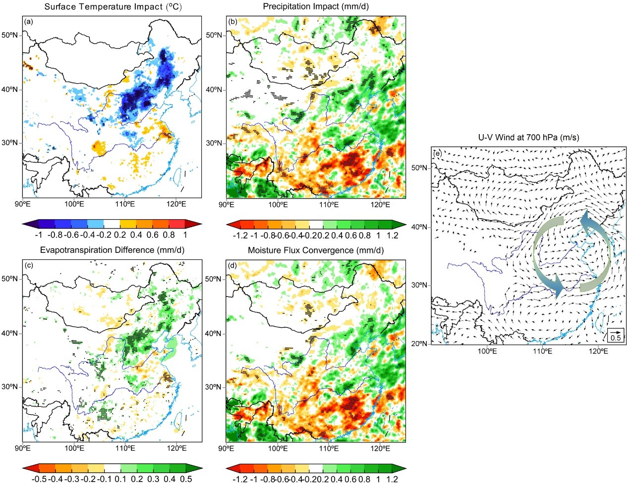 圖1. 植被變綠對(duì)近地表氣溫(a),降水(b),蒸散(c),水汽輻合(d)和環(huán)流(e)的影響。
