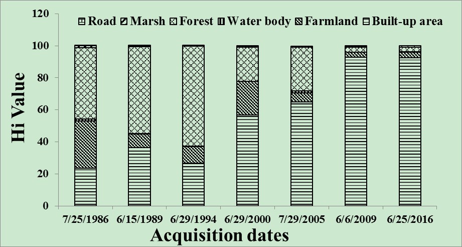 近些年來經(jīng)濟不斷發(fā)展、城市持續(xù)擴張,使得城市熱島效應不斷增強,福州市已經(jīng)連續(xù)多年成為中國新的“四大火爐”城市之一。根據(jù)氣象記錄,福州市連續(xù)日最高溫超過35℃的天數(shù)從2003年的24天增加到2013年的33天。城市熱島已經(jīng)成為影響構(gòu)建健康、舒適、宜居及可持續(xù)的福州市人居環(huán)境的重要因素。目前城市熱島相關(guān)研究很多,例如,濕地的冷島作用對城市熱島具有一定的緩解效果,但對于城市擴張導致濕地喪失對城市熱島效應時空分布的影響尚待分析。東北地理所水環(huán)境遙感團隊利用Landsat系列衛(wèi)星影像數(shù)據(jù)和單窗算法反演了福州市地表溫度,分析了1986-2016年城市熱島強度指數(shù)與景觀格局演變的關(guān)系,研究福州市城市熱島的發(fā)展規(guī)律和驅(qū)動機制,并重點討論了濕地對其他不同地表類型的降溫效果和40年來濕地降溫面積變化趨勢。研究發(fā)現(xiàn),建設用地對城市熱島效應的貢獻率從1986年的24%增加到2016年93%,而城市熱島強度增加主要原因是城市建設用地的擴張。研究利用GIS緩沖區(qū)分析方法統(tǒng)計了不同土地利用類型受到濕地影響距離和面積,發(fā)現(xiàn)1985至2015年的毗鄰區(qū)域受到濕地影響范圍呈現(xiàn)在波動中降低的趨勢,影響范圍下降平均速度為4.7km2/年。濕地喪失所導致濕地冷島效應的減弱,進一步促進了福州市熱島效應增強,而濕地面積減少的主要原因正是濕地轉(zhuǎn)化為建筑用地。研究結(jié)果可為城市規(guī)劃、城市建設及提升人居環(huán)境質(zhì)量等提供理論依據(jù)與決策支持。