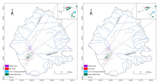 圖2 RCP 4.5 和RCP 8.5情景下松嫩平原濕地優(yōu)先恢復(fù)區(qū)及其當(dāng)前土地利用類型