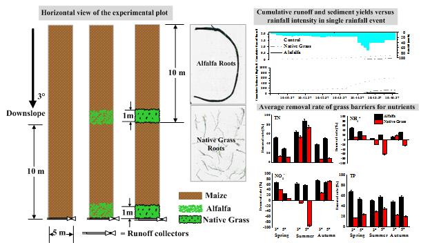 東北黑土區是中國重要的糧食核心產區和最大的商品糧生產基地,由于坡地被大量墾殖,水土流失逐年加劇,造成了嚴重的農業面源污染。目前采用的最佳管理措施(BMPs),如壟作區田、地埂、魚鱗坑等,多以水土保持為目標進行設計,對于污染的削減主要通過大量攔截泥沙、徑流來實現。這些措施可能造成上游來水銳減,影響下游河流和湖庫的水生態質量,尤其是在水源地流域,入庫徑流的減少可能造成水質進一步惡化、供水保證率降低,給下游居民的生產、生活用水帶來困難。為此,東北地理所水環境污染與防治學科組科研人員研發了新型等高植物草籬技術,并利用在吉林省遼源市東遼縣杏木國家級水土保持示范園區內的標準小區,開展了草籬污染物削減能力實地監測與模型模擬驗證工作。