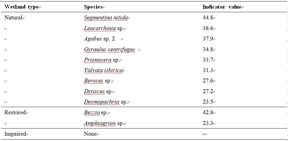 表1 三江平原自然濕地、恢復濕地和受損濕地指示物種分析結果