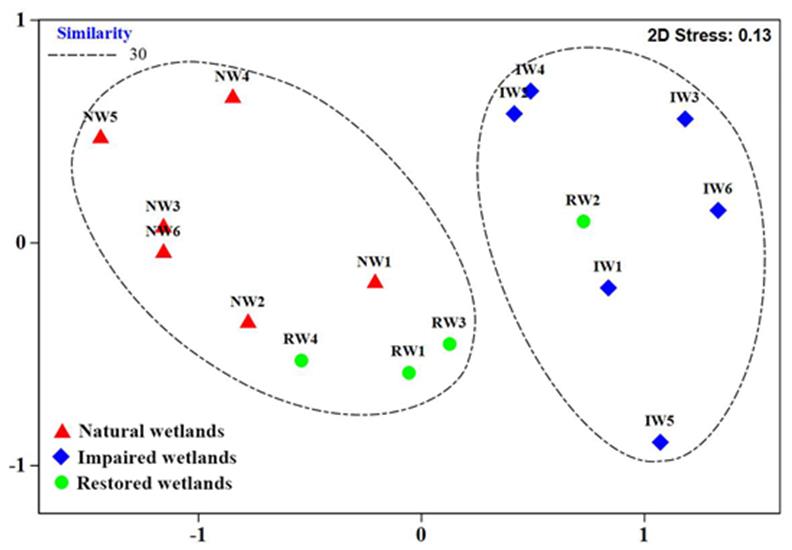 圖1 不同類型濕地水生無脊椎動物群落組成的非度量多維尺度標序圖