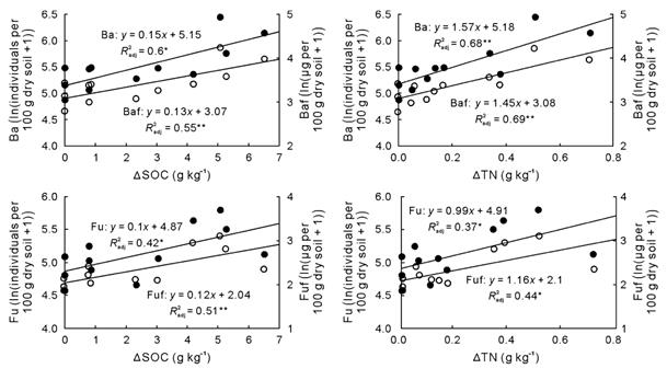 圖2 土壤線蟲豐度和代謝足跡與土壤有機碳和總氮增量的關系