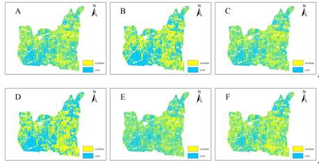 圖2 不同處理方式下克山農場作物分類結果(A-F)
