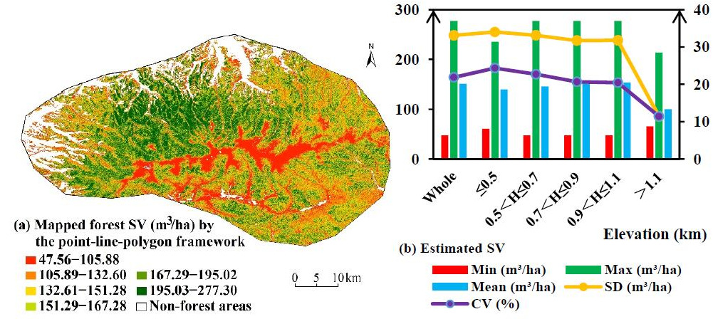 本研究首次集成了高分辨率星載激光雷達(GEDI,2019年發布)、雷達和可見光數據,構建了基于“點—線—面”框架的高精度蓄積量遙感反演模型。研究發現,將激光雷達足跡數據作為“線性橋”連接實測點數據與多源影像面數據進行蓄積量估算的精度高于傳統的基于實測點和多源影像數據的精度。在眾多特征因子中,冠層覆蓋度、樹高、海拔、紅邊波段光譜指數對森林蓄積量敏感性最高。本研究結果不僅有助于深入理解東北森林典型樣區蓄積量空間分布,且可為制定東北森林可持續利用與科學保護的管理決策提供重要的數據支撐。