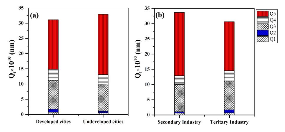 圖1 城市水體CDOM熒光強度a)發(fā)達程度b)主體產(chǎn)業(yè)