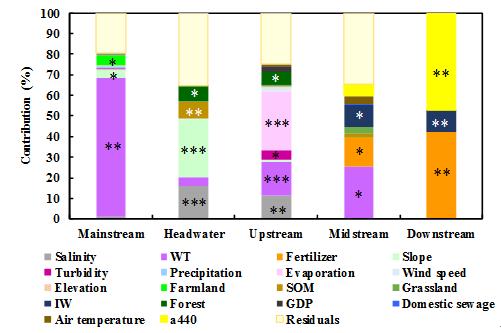 黃河是世界第五大長河,中國第二長河,黃河碳傳輸對亞洲河流碳循環(huán)具有重要影響。中國科學(xué)院東北地理與農(nóng)業(yè)生態(tài)研究所水環(huán)境遙感學(xué)科組的科研人員對黃河流域水體DOC進行了野外調(diào)查采樣,發(fā)現(xiàn)黃河干流不同河段水體中DOC濃度具有明顯差異(p < 0.01),中游河段水體DOC濃度明顯高于其他河段(4.13 ± 0.91 mg/L)。同時基于碳穩(wěn)定同位素技術(shù)解析了黃河水體中DOC來源,分析結(jié)果表明黃河源頭和上游水體中的DOC主要來源于陸生性植物貢獻(94%,61%),但是中游和下游DOC主要來源于土壤有機物質(zhì)(36%,37%),并且在中下游河段,生活污水對河水DOC的貢獻也明顯增多(17%-18%)。在黃河源頭和上游河段,河水中DOC濃度主要受自然因素影響,包括流域坡度和蒸發(fā)量等;在中游和下游河段,河水中DOC濃度主要受工業(yè)廢水排放量和化肥施用量的影響(圖1)。本研究結(jié)果有助于進一步理解在人類干擾導(dǎo)致的黃河水體碳輸送特征變化的背景下,平衡發(fā)展與保持環(huán)境可持續(xù)性的重要性。同時,本研究為進一步開展河流碳循環(huán)研究工作奠定了堅實基礎(chǔ)。