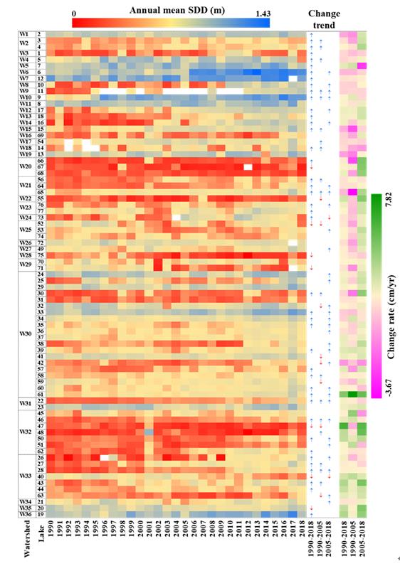 圖1 不同時段77個湖庫的年均透明度變化以及年變化率。