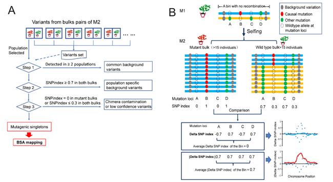 (A) 變異過濾過程概述。(B) 定位攜帶因果突變的基因組區域的原理圖。ΔSNP-index絕對值曲線(紅色曲線)用于識別因果突變區域。