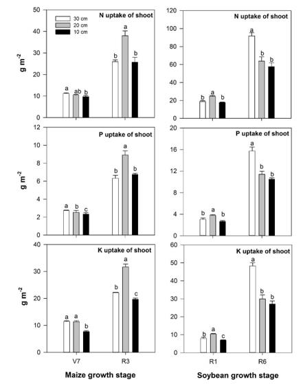 圖2. 2017年耕層厚度對玉米拔節期(V7)和乳熟期(R3)及大豆始花期(R1)和鼓粒期(R6)植物營養吸收的影響