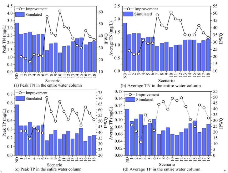 圖2 TN和TP的峰值濃度(a, c)和平均(b, d)濃度,以及不同情景下IPWQ的變化。“ND”表示沒有引調水