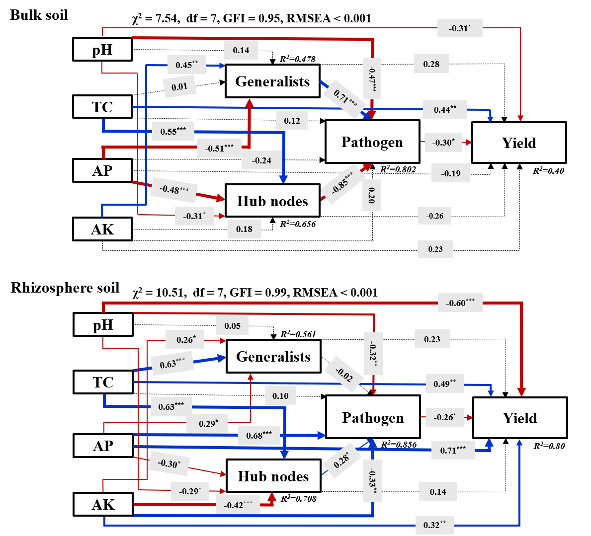 耕作方式顯著改變了土壤微生物群落的裝配過程。MP處理下細菌群落裝配的隨機過程,特別是同質性擴散(homogenizing dispersal),顯著高于NT和RT,這可能是由于MP較強的土壤擾動,導致微生物的擴散速率增加(圖2)。微生物分子生態網絡表明,RT較NT和MP形成更穩定的網絡結構,且RT有助于提高關鍵物種(keystone taxa)介導的土壤養分有效性,緩解植物病原菌的生態風險,而MP網絡中的核心物種大多為潛在的植物病原菌。結構方差模型(SEM)分析結果顯示,MP處理引起潛在病原微生物及相互間正向關聯性作用,而RT處理具有較穩定的微生物網絡結構,無效的病原菌傳播路徑減少,導致RT產量高于MP(圖3)。