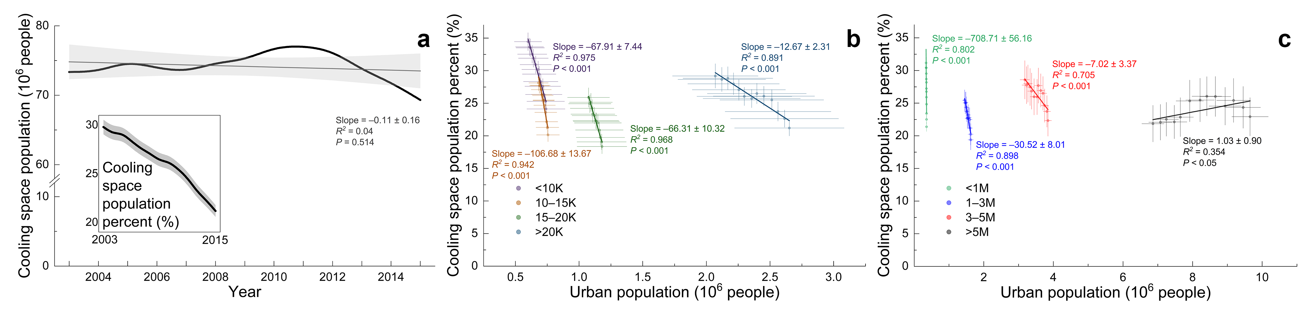 進一步分析表明,UGS的減少直接導致了UGS在夏季的降溫空間收縮。主城區的UGS降溫空間覆蓋度從32.55%下降到24.39%,在欠發達城市同樣較快。因此,越來越多的城市居民失去了在夏季接觸UGS降溫的機會,享受UGS降溫的居民比例從29.79%下降到21.17%,這個下降速度快于UGS覆蓋率的下降速度。在2003-2015年,在夏季不能接觸UGS降溫服務的居民人數每年增長約423萬。在2015年,約2.6億城市居民不能接觸UGS的降溫服務,接近于世界第三人口大國的人口數量。造成這種情況的原因一方面是UGS的快速減少,另一方面是因為城市居民的增長區域缺少UGS降溫空間的覆蓋。因此,為了緩解城市熱挑戰、全面實現中國城市的可持續發展,制定有針對性的城市綠化方案勢在必行,并且應該特別關注那些經濟實力較弱、人口較少的欠發達城市。
