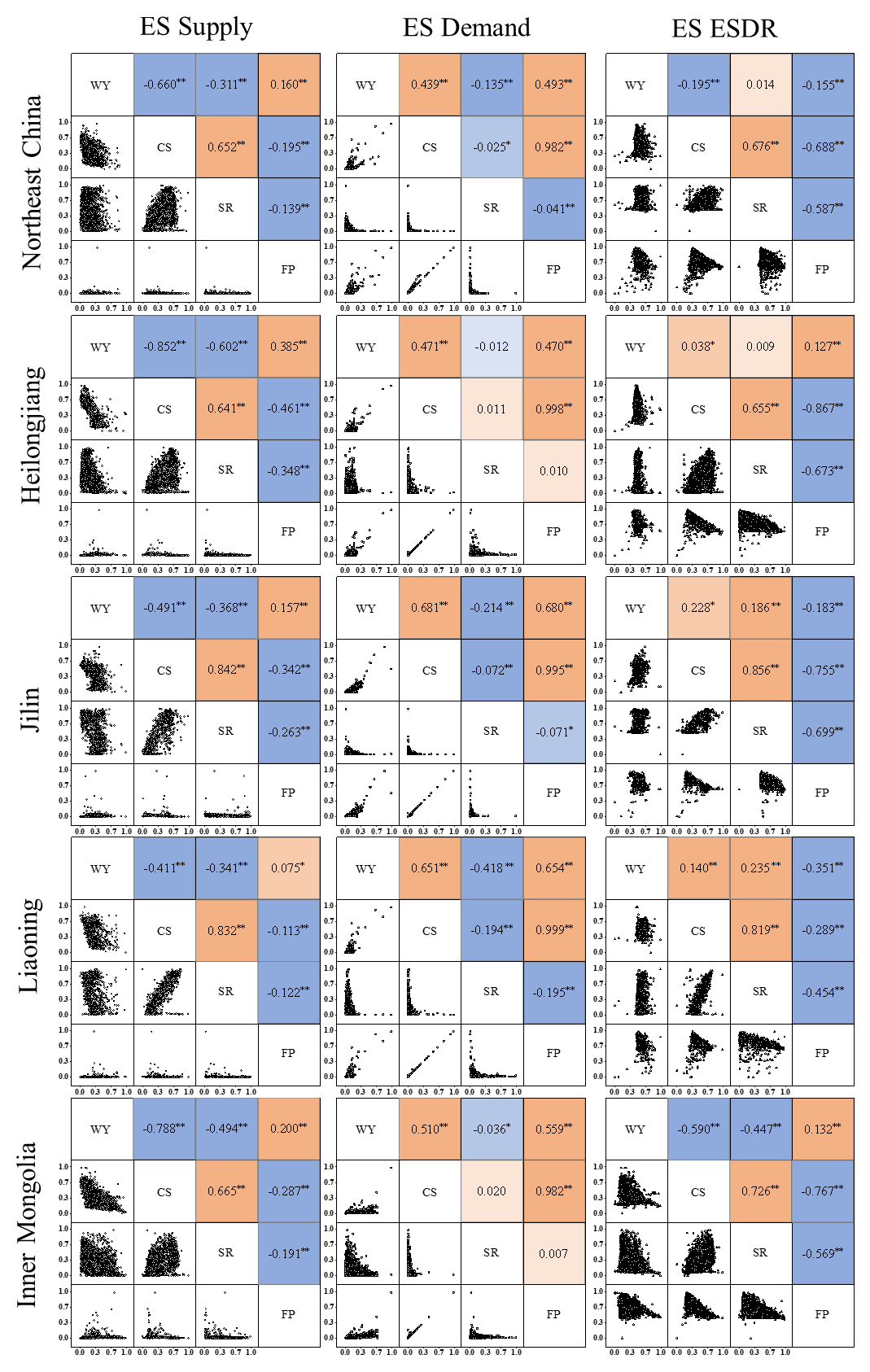 圖1 東北地區(qū)生態(tài)系統(tǒng)服務(wù)相關(guān)系數(shù)圖。WY:產(chǎn)水量,CS:碳固持,SR:土壤保持,F(xiàn)P:食物供給。(沒有*表示p≥ 0.05; * 表示p<0.05; **表示p<0.01)