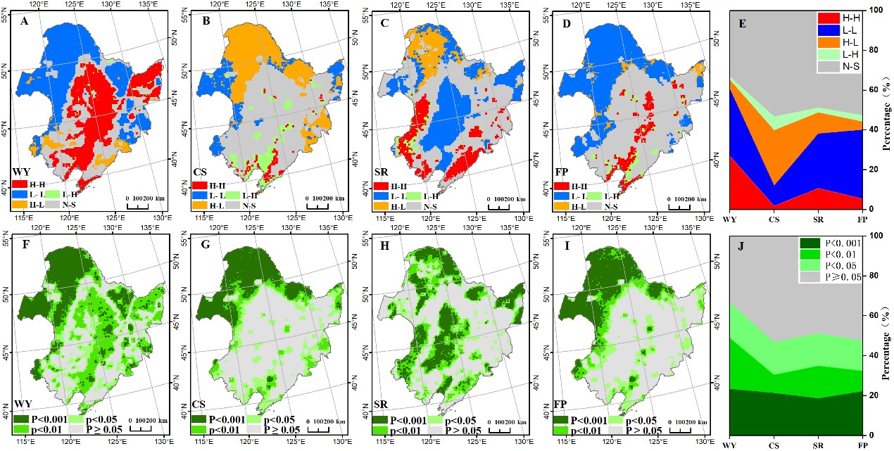 圖2 東北地區(qū)生態(tài)系統(tǒng)服務(wù)供需匹配空間分布。WY:產(chǎn)水量,CS:碳固持,SR:土壤保持,F(xiàn)P:食物供給。H-H:高高型空間匹配,L-L:低低型空間匹配,H-L:高低型空間錯位,L-H:低高型空間錯位。