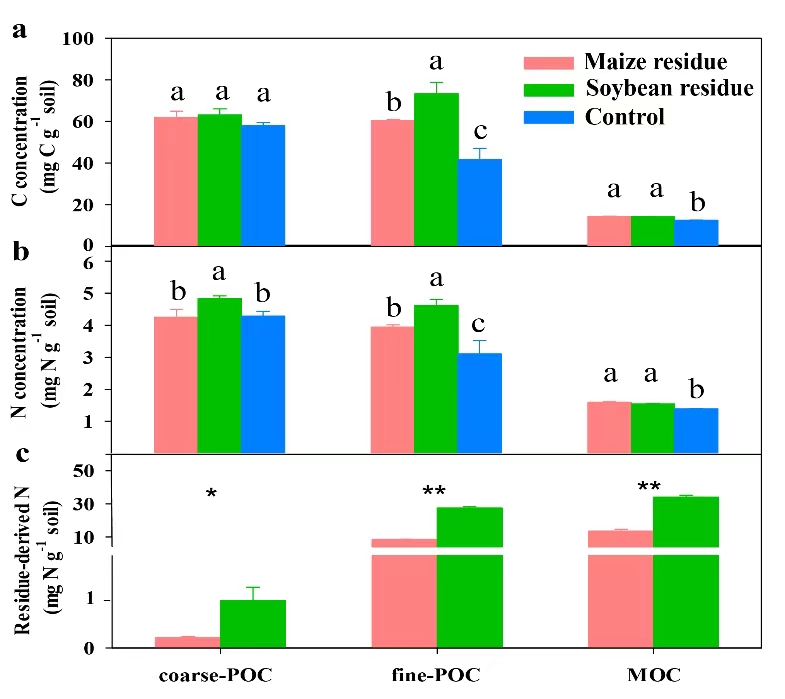 圖1. 培養(yǎng)250天后土壤有機(jī)質(zhì)組分中碳(a)、氮(b)以及秸稈來源氮(c)含量