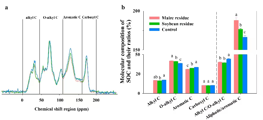 圖2. 培養(yǎng)250天后土壤有機(jī)碳13C-NMR核磁波譜(a)以及不同官能團(tuán)比例(b)