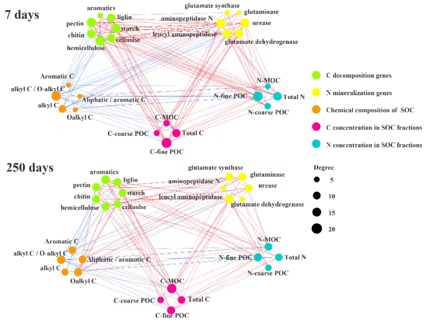 圖3. 培養(yǎng)7天和250天后土壤有機(jī)碳結(jié)構(gòu)、有機(jī)質(zhì)組分碳氮含量以及氮礦化和碳降解功能基因豐度的相關(guān)性網(wǎng)絡(luò)
