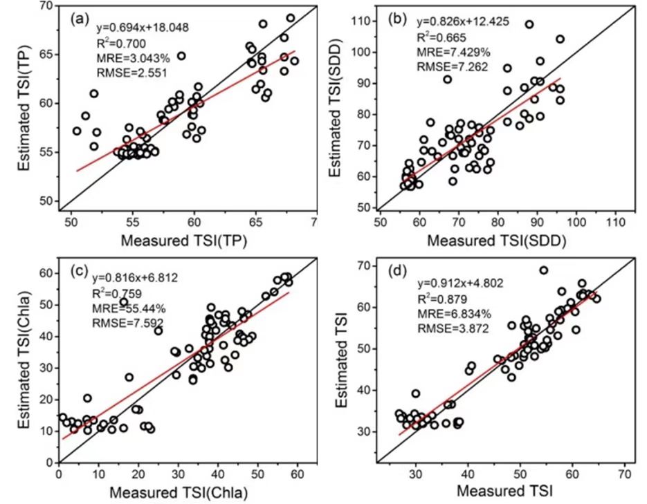 圖1. 各參數(shù)及綜合營養(yǎng)狀態(tài)指數(shù)實(shí)測值與估算值散點(diǎn)圖,(a): TSI(TP)、(b): TSI(SDD)、(c): TSI(Chla) 和(d):TSI。