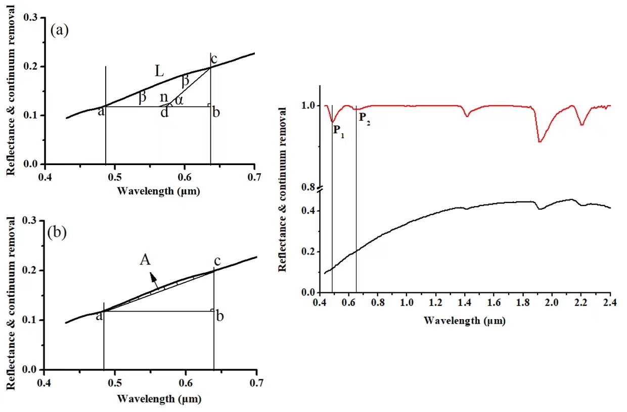光譜特征參數(shù)是對(duì)光譜曲線吸收特征的描述,在土壤屬性預(yù)測(cè)和土壤分類中被很多廣泛使用。對(duì)于土壤分類,因不同土壤的理化性質(zhì)差異會(huì)引起土壤在不同波長(zhǎng)上的光譜反射差異,光譜特征參數(shù)可以有效的區(qū)分不同土壤類型。但對(duì)于土壤屬性預(yù)測(cè),光譜特征參數(shù)的使用不如光譜微分和數(shù)學(xué)變換普遍,而且使用的光譜特征參數(shù)都是基于包絡(luò)線去除后提取的吸收深度、吸收面積或吸收位置等。本研究發(fā)現(xiàn),對(duì)于低有機(jī)質(zhì)含量的土壤,隨著SOM含量的變化,在土壤反射光譜曲線上的可見光部分具有較明顯的形狀變化。