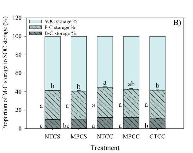 圖2 a)微生物殘體碳、真菌殘體碳以及細菌殘體碳儲量;b)微生物殘體碳、真菌殘體碳以及細菌殘體碳儲量與總有機碳儲量比例