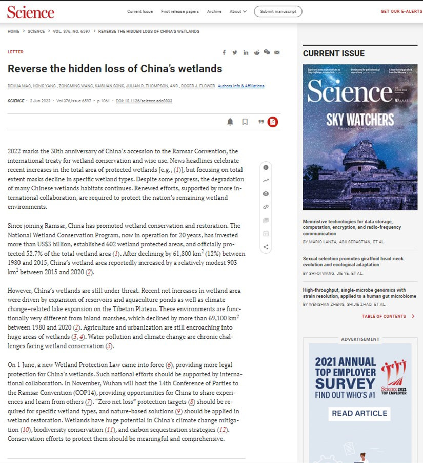 Dehua Mao, Hong Yang*, Zongming Wang, Kaishan Song, Julian R. Thompson, Roger J. Flower. Reverse the hidden loss of China’s wetlands, Science, 2022. 376 (6597): 1061-1061. DOI: 10.1126/science.adc8833.