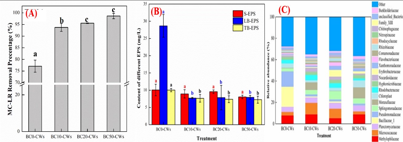 研究結果表明:(1)MFC-CWs在48 h之內便可實現對水中N、P和MC-LR的高效去除,且閉路運行(T1)的MFC-CWs在N、P和MC-LR的去除性能方面要顯著(p < 0.05)優于開路運行(CK)系統,主要是因為MFC-CWs中存在較多的微囊藻毒素降解菌(如:鞘脂單胞菌科(Sphingomonadaceae)、伯克氏菌科(Burkholderiaceae)、微球菌科(Micrococcaceae)和黃單胞菌目(Xanthomonadales)),系統內電子轉移速率和微囊藻毒素降解菌相對豐度的提高是MFC-CWs能夠高效凈化高濃度MC-LR(?15 μg/L)的關鍵;進一步通過海綿鐵對MFC-CWs的陽極區進行強化(T2),MC-LR的凈化效率并未得到提升(圖1)。(2)BC-CWs對N、P和MC-LR的去除效率顯著(p < 0.05)提升,而胞外聚合物的含量顯著(p < 0.05)降低(圖2B),從而降低了系統堵塞的風險;生物炭基質吸附性能的提高和功能微生物相對豐度的增加是BC-CWs去除效率提高的主要原因。綜合去除效率和經濟成本,建議實際應用中生物炭的最佳體積投加比為20%。