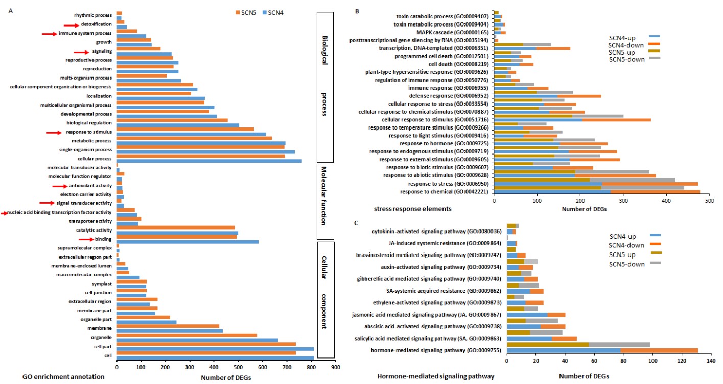大豆孢囊線蟲病(SCN,Heterodera glycines)是制約大豆生產的全球毀滅性病害之一。大豆抗病品種應用是防治大豆孢囊線蟲病最經濟有效的方法,然而大豆對大豆孢囊線蟲的抗性是由多基因控制并具有數量性狀的特性,但抗性背景單一,線蟲生理小種易發生變異,因此亟需開發多抗基因資源和培育多抗品種。農田有害生物控制學科組王從麗研究員團隊在前期研究過程中篩選到一個新的大豆抗線蟲育種基因型09-138(rhg1a + Rhg4b),對毒性強的生理小種(SCN4)具有抗性,但對毒性弱的生理小種(SCN5)感病(Huang等,2022,Nematology),為了充分利用該抗性資源,了解其抗性機制,該團隊首次在大豆上利用三代全長轉錄組測序技術(Oxford Nanopore Technology, ONT)開展了該大豆種質對孢囊線蟲親和性(感?。┖头怯H和性(抗病)反應的調控機理研究。