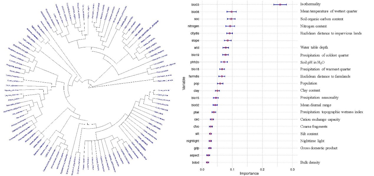圖1. 中國內陸沼澤濕地優勢種發育關系及各環境因子重要性