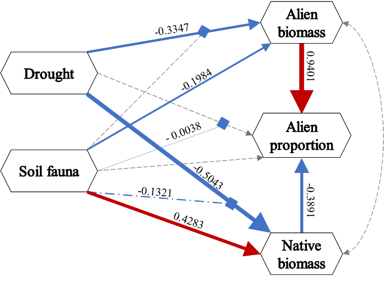 圖3 結構方程模型(SEM)顯示了干旱、土壤動物及其相互作用對外來目標植物、本地植物群落生物量以及外來目標植物在群落中的生物量比例