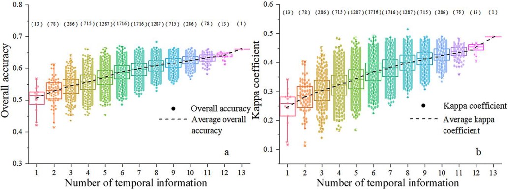 圖2 不同時(shí)相信息數(shù)量的總體精度和kappa系數(shù)。箱線圖上方括號(hào)中的數(shù)字表示多時(shí)相多光譜數(shù)據(jù)中不同多光譜圖像組合的數(shù)量。