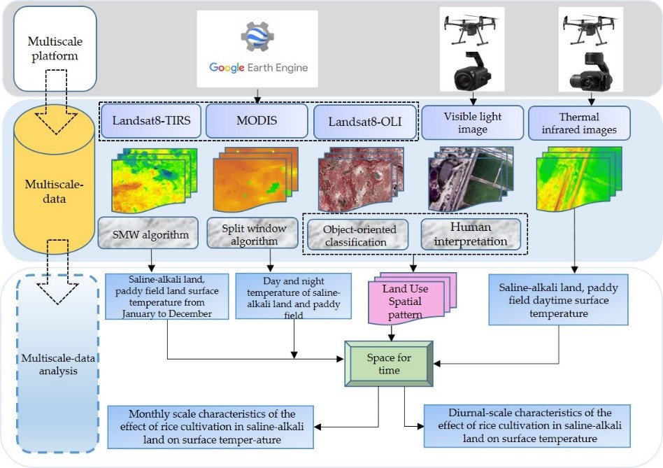 因此,本研究以吉林省西部大安市為研究區,利用1km MODIS產品、30m Landsat 8衛星圖像和厘米級無人機圖像,獲得了鹽堿地和水田地表溫度的多尺度數據,分析了鹽堿地和水田在一年中不同月份和一天中不同時間的地表溫度變化特征。并采用“空間代時間”的方法評估了鹽堿地種稻對局地地表溫度的影響。基于衛星觀測的結果表明,在作物生長季,鹽堿地地表溫度顯著高于稻田,尤其是在生長季中期的7月和8月;鹽堿地種稻的降溫效應主要集中在白天而非夜晚;基于無人機熱紅外觀測結果進一步證實了這一結論。