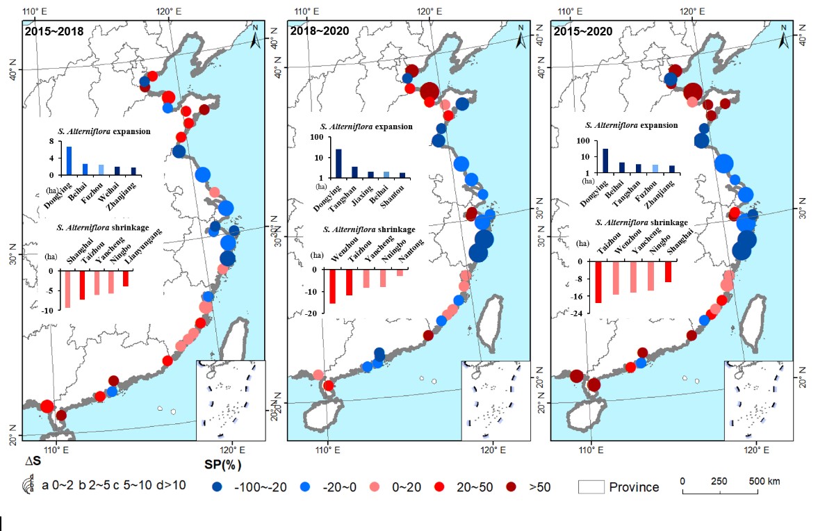中科院東北地理所地理景觀遙感學科組研究人員,基于遙感大數據和地面調查樣點,應用已研發的集成面向對象和支持向量機的互花米草分布信息提取方法,獲取了2015(SDGs元年)、2018和2020年(相關SDGs完成年)中國濱海互花米草分布數據集及入侵土地覆被類型數據集;在國家、省域及熱點城市三個尺度上解析了2015-2020年中國濱海互花米草的時空變化特征;評估了面向SDGs的中國互花米草治理成效及存在問題。