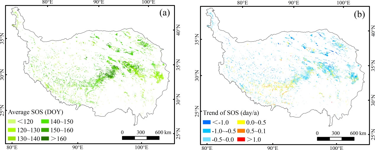 圖1 青藏高原沼澤植被春季物候多年平均值及變化趨勢值