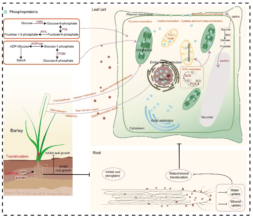 近年來,納米氧化鋅(ZnO NPs)在農(nóng)業(yè)生產(chǎn)中作為納米肥料大量使用。已有研究表明,ZnO NPs能夠增加植物的光合碳同化、水分利用效率和脅迫抗性。然而,ZnO NPs的過量使用會抑制根的生長,改變植物的生理過程,影響植物的生長和產(chǎn)量。另外,納米塑料(nPS)的大量生產(chǎn)與應(yīng)用也使塑料污染成為世界范圍內(nèi)的環(huán)境問題之一。然而,我們對ZnO NPs和nPS互作對植物生長的影響知之甚少。為此,東北地理所作物生理與栽培學(xué)科組研究人員以大麥(Hordeum vulgare)為研究對象,針對ZnO NPs和nPS互作影響大麥蛋白磷酸化的機(jī)制展開研究。