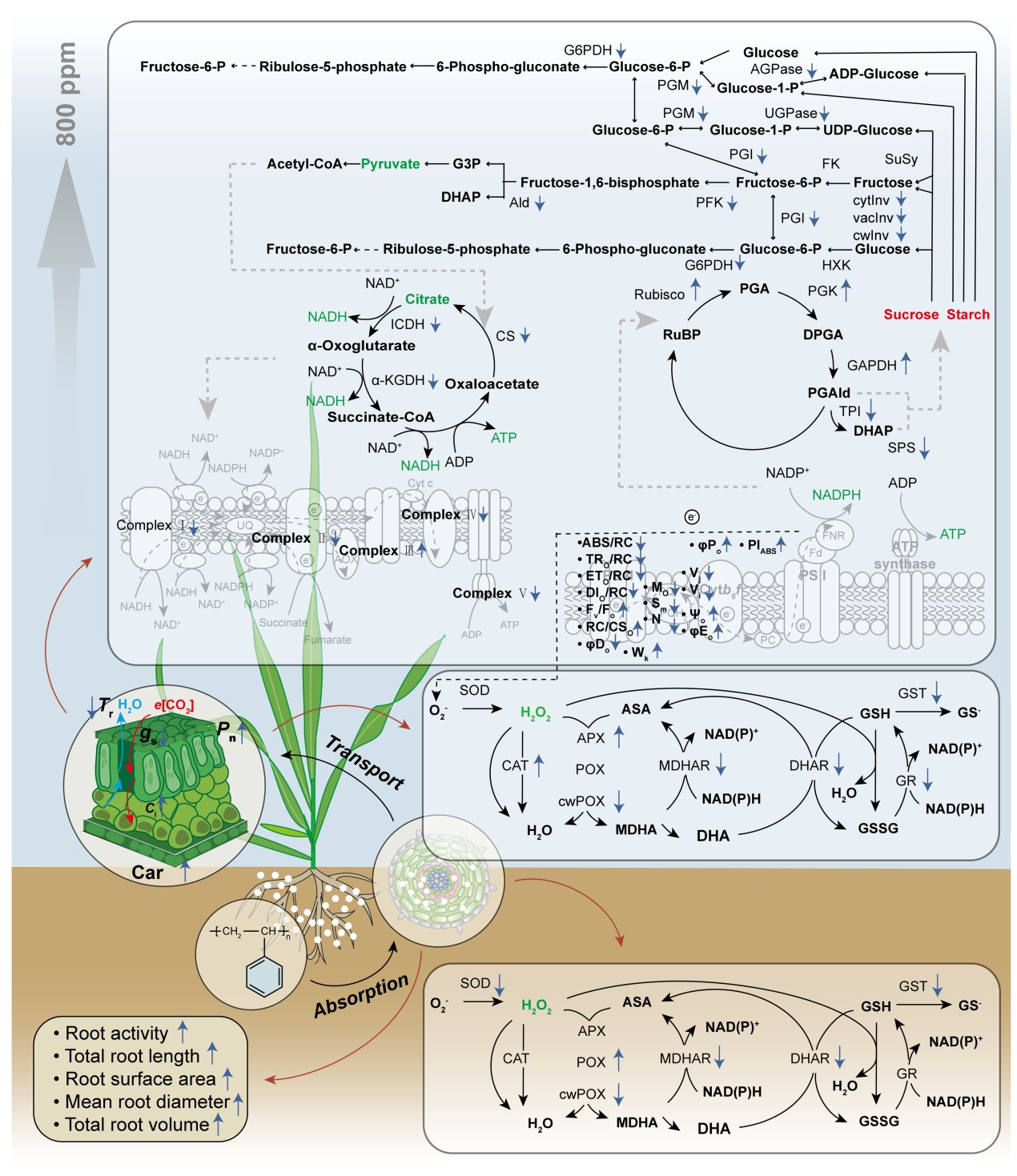 圖1. 大麥響應(yīng)納米塑料和大氣CO2濃度升高的生理響應(yīng)機(jī)制