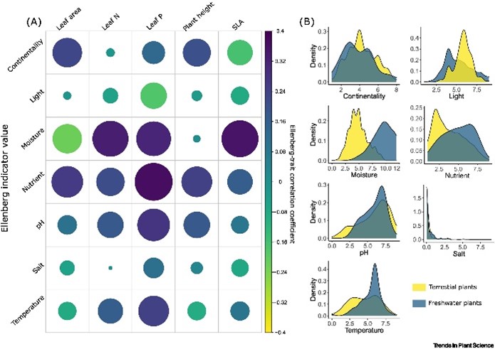 (2)水生植物的功能性狀可以用來指示其所在生態(tài)系統(tǒng)特征。以Ellenberg指數(shù)為例,不同水生植物功能性狀對其生境的大陸性、光照、濕潤度、營養(yǎng)、pH值、鹽度、溫度等指標(biāo)具有相應(yīng)的指示作用(圖2A),并展示出與其他陸生植物不同的格局和趨勢(圖2B)。