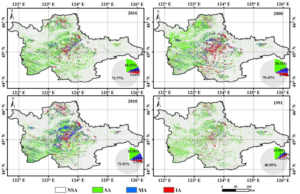 圖1 1991-2016年吉林省西部土壤鹽漬化等級空間分布圖(NSA:非鹽漬化區,SA:輕度鹽漬化區,MA:中度鹽漬化區,IA:重度鹽漬化區)