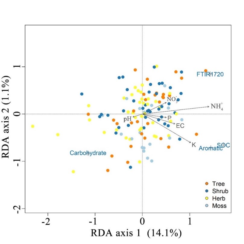 為深入了解環(huán)境要素變化對(duì)多年凍土區(qū)泥炭沼澤碳庫(kù)穩(wěn)定性影響,研究人員利用FTIR紅外光譜過(guò)對(duì)大興安嶺北部多年凍土區(qū)泥炭沼澤不同優(yōu)勢(shì)植被群落下表層土壤及沉積柱芯中有機(jī)質(zhì)化學(xué)結(jié)構(gòu)進(jìn)行對(duì)比分析。研究發(fā)現(xiàn),速效鉀、速效磷等營(yíng)養(yǎng)元素是影響表層土壤有機(jī)質(zhì)化學(xué)結(jié)構(gòu)的關(guān)鍵因素,并與其芳香族化合物和有機(jī)碳的含量呈現(xiàn)正相關(guān)關(guān)系、多糖類化合物含量呈現(xiàn)負(fù)相關(guān)關(guān)系(圖1)。