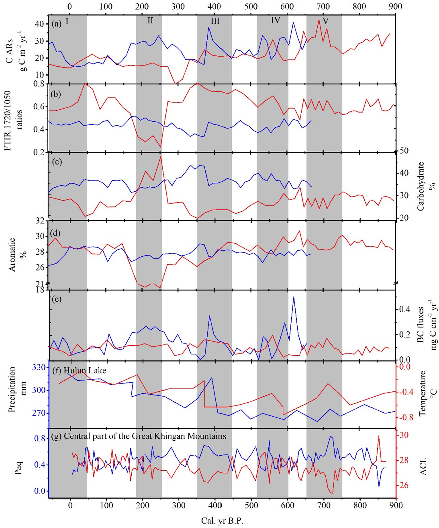 過(guò)去千年以來(lái),局部降水和火擾動(dòng)的差異有可能是引起泥炭沼澤碳庫(kù)穩(wěn)定性產(chǎn)生變化的主要因素(圖2)。特別是在距今250-200年, 高強(qiáng)度的火擾動(dòng)促使更多草本的生長(zhǎng)并導(dǎo)致這一時(shí)期累積的植物凋落物中含有較高含量的多糖類化合物,并導(dǎo)致勁濤(JT)泥炭沼澤在這一時(shí)期累積了更多的多糖類化合物和較低的芳香族化合物,并高于宏圖(HT)泥炭沼澤。而在其他時(shí)期, HT泥炭沼澤碳庫(kù)中多糖類化合物明顯高于JT泥炭沼澤,而芳香族化合物在兩個(gè)泥炭柱芯中相近,并推測(cè)降水差異是導(dǎo)致HT泥炭沼澤土壤碳庫(kù)穩(wěn)定性略低于JT泥炭沼澤。