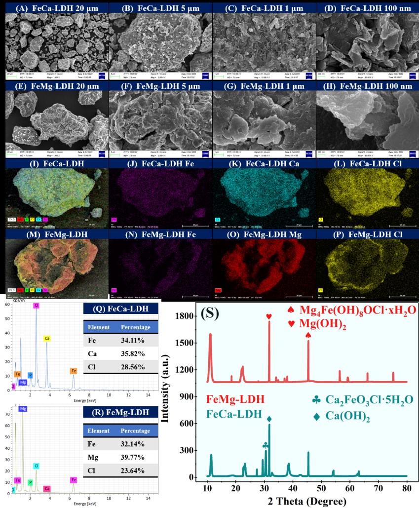 圖 2 鐵基層狀雙氫氧化物的結構(A-H:SEM;I-P:EDS;S:XRD)