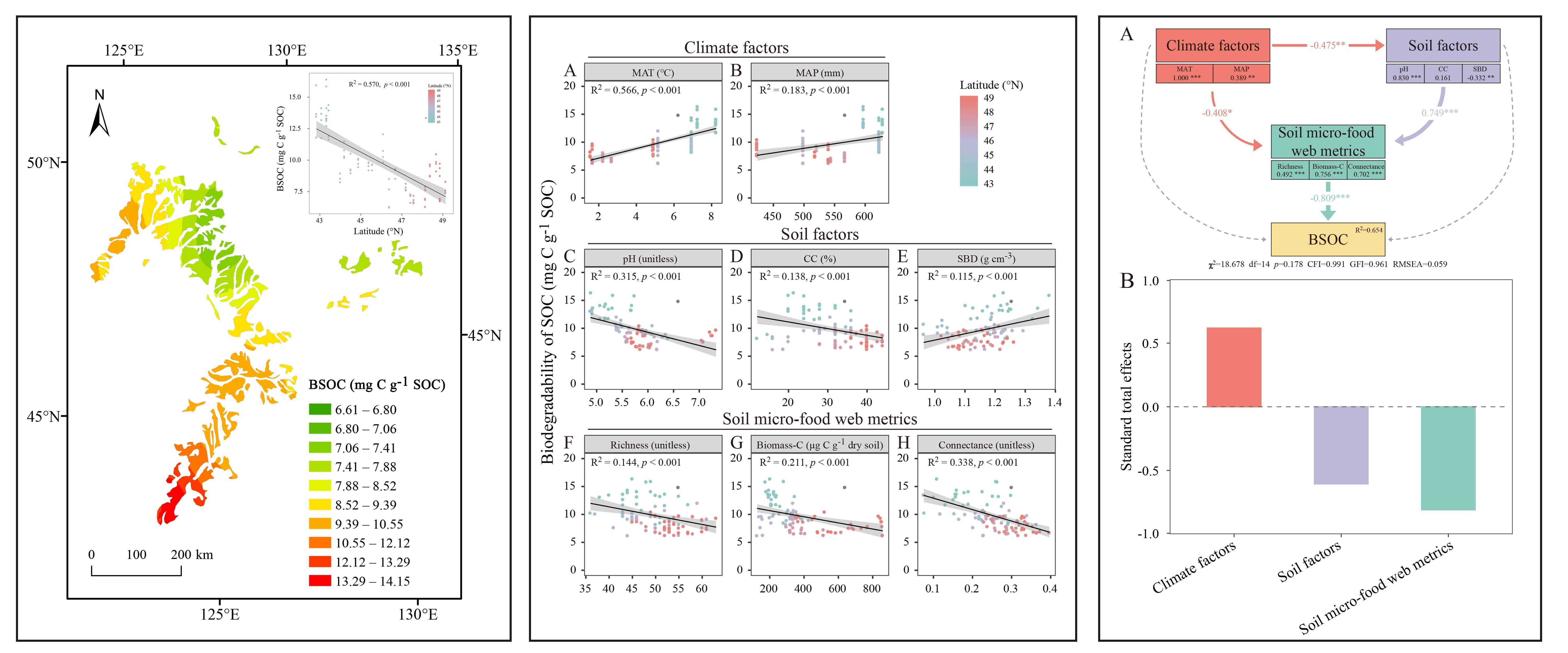 中國科學(xué)院東北地理與農(nóng)業(yè)生態(tài)研究所黑土有機(jī)碳與保護(hù)性耕作學(xué)科組科研人員以中國東北典型黑土區(qū)43°N-49°N緯度范圍內(nèi)的農(nóng)田土壤為研究對象,將土壤生物、氣候、土壤因子耦合起來,在區(qū)域尺度上深入揭示了農(nóng)田黑土有機(jī)碳生物降解性的緯度分布格局及其驅(qū)動機(jī)制。研究發(fā)現(xiàn)土壤有機(jī)碳生物降解性隨緯度增加呈現(xiàn)北低南高的分布格局,該變化趨勢主要受到隨緯度變化的土壤微食物網(wǎng)特性(豐富度、生物量碳和連通性)、氣候因子(年平均溫度和年平均降水)、土壤因子(土壤pH、土壤粘粒含量、土壤容重)的調(diào)控作用。通過結(jié)構(gòu)方程模型發(fā)現(xiàn),土壤微食物網(wǎng)特性是影響土壤有機(jī)碳生物降解性最直接且最重要的驅(qū)動因素。研究結(jié)果強(qiáng)調(diào)了土壤生物在調(diào)控農(nóng)田生態(tài)系統(tǒng)土壤有機(jī)碳礦化和固存中的重要作用。