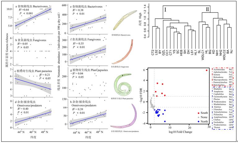 此外,利用形態(tài)學(xué)鑒定技術(shù)首次全面評估了土壤線蟲群落結(jié)構(gòu)在典型黑土區(qū)的緯度分布格局。研究發(fā)現(xiàn)土壤線蟲總豐富度和總多度的緯度分布格局與土壤有機(jī)碳生物降解性類似,均呈現(xiàn)均隨緯度增加而顯著增加的變化趨勢;并且線蟲群落以47°N為分界線可分為南部和北部兩類,土壤pH和土壤容重分別是影響南部與北部黑土區(qū)線蟲群落最重要的環(huán)境因子。